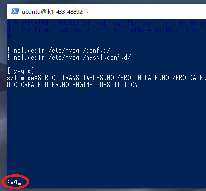 貼り付け完了後「ESC」キーを入力しINSERTモードを終了し、「:wq」を入力後「Enter」キーを入力し、保存します。