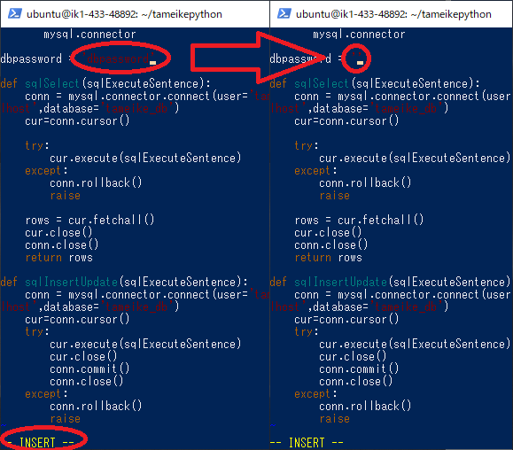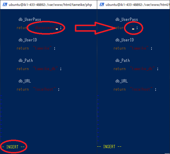 テキストエディタに切り替え後、「i」キーを入力してモードを「– INSERT –」モードへ変更します。その後、先ほどと同様に「dbpassword」部分を、「↓」キーや「→」キーを入力し移動後、「バックスペースキー」を入力して削除します。