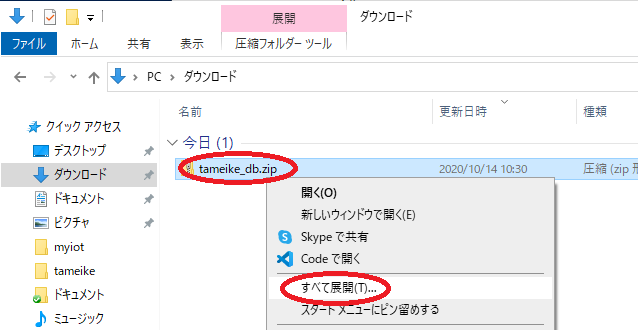 ダウンロード完了後、ダウンロードフォルダを開き、ダウンロードした「tameike_db.zip」ファイルを右クリックし、「すべて展開(T)…」メニューをクリックします。