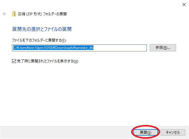 展開先の選択とファイルの展開ウィンドウが表示されますので、「展開(E)」ボタンをクリックします。