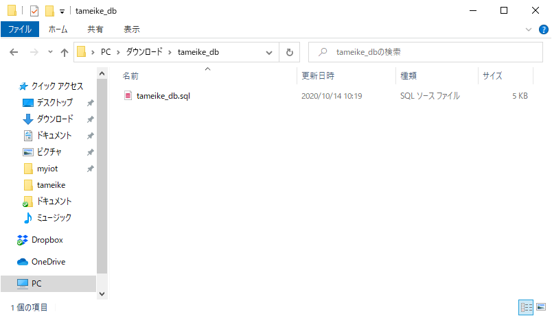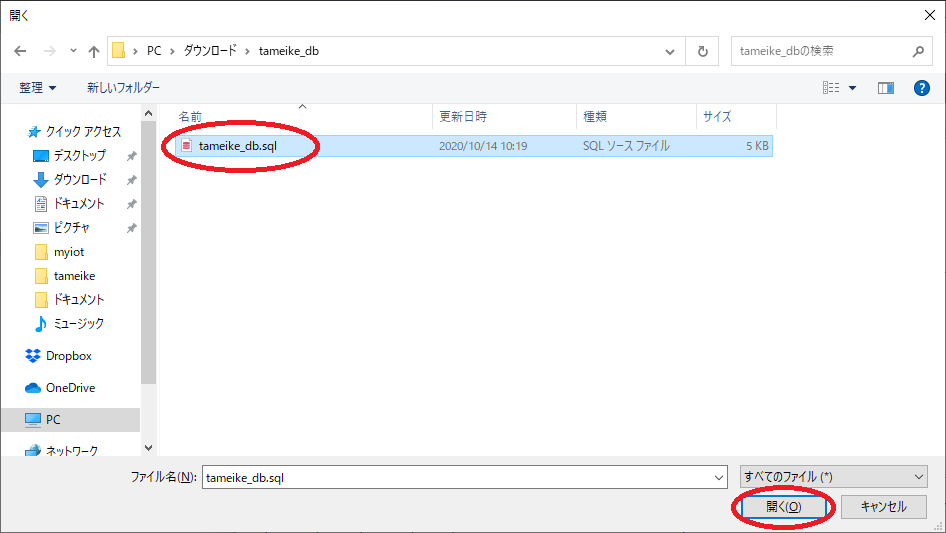 先ほど展開したtameike_dbフォルダ内「tameike_db.sql」ファイルを選択し「開く(O)」ボタンをクリックします。