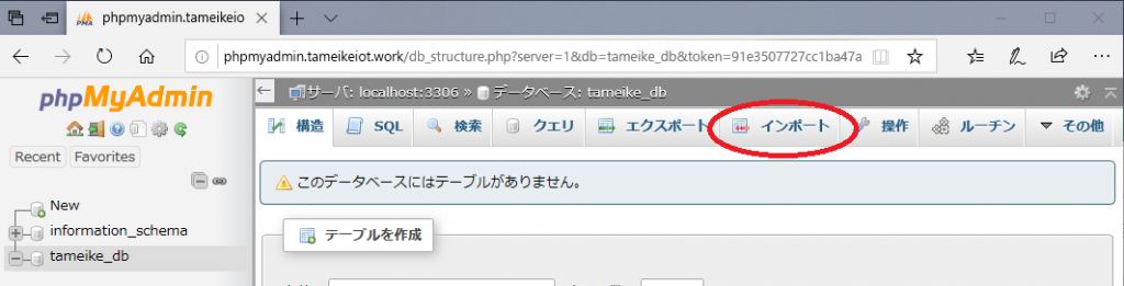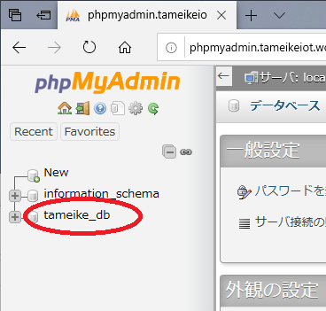 phpMyAdmin管理画面が表示されますので、画面左側「tameike_db」メニューをクリックします。