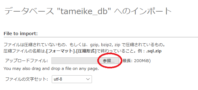 データベース “tameike_db” へのインポート画面が表示されますので、File to import:欄のアップロードファイル:「参照」ボタンをクリックします。