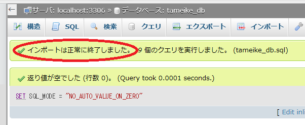 「インポートは正常に終了しました。」と表示され、データを格納する為のテーブル作成が完了します。