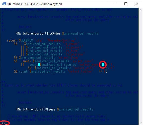 移動後「)」を入力します。入力完了後「ESC」キーを入力しINSERTモードを終了し、「:wq」を入力後「Enter」キーを入力し、保存します。