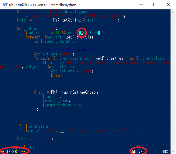 テキストエディタに切り替え後、「i」キーを入力してモードを「– INSERT –」モードへ変更します。その後、「PageDown」キーや「↓」キー、「→」キーを入力しカーソルを551行目39「$」まで移動します。