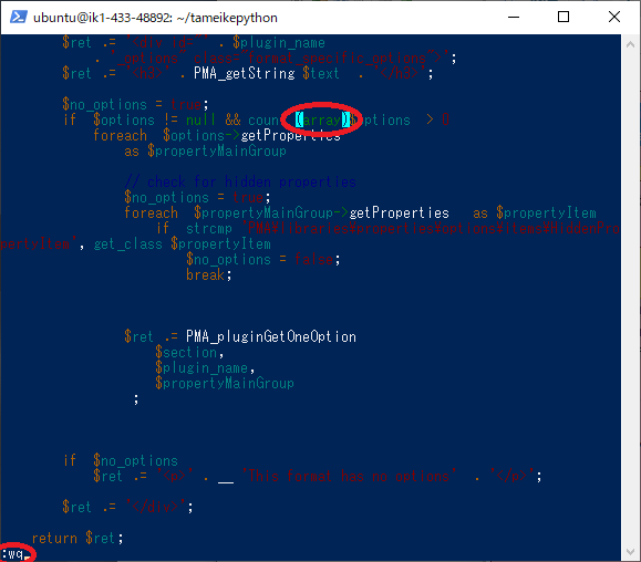 移動後「(array)」を入力します。入力完了後「ESC」キーを入力しINSERTモードを終了し、「:wq」を入力後「Enter」キーを入力し、保存します。