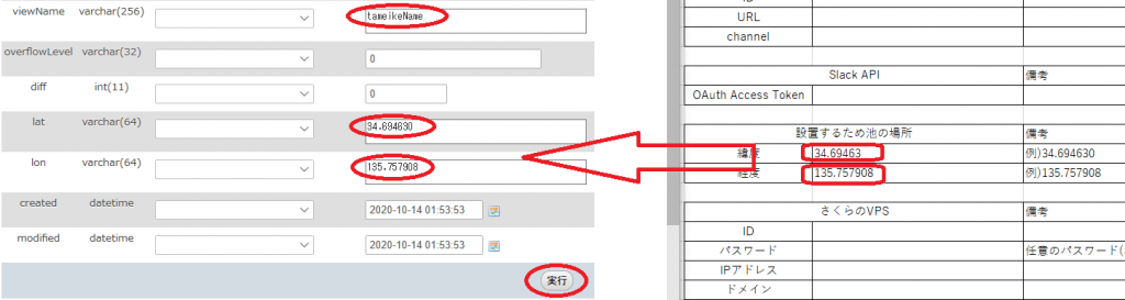 lat欄に、ため池監視システム重要情報エクセルファイルの設置するため池の場所欄の緯度情報を入力します。