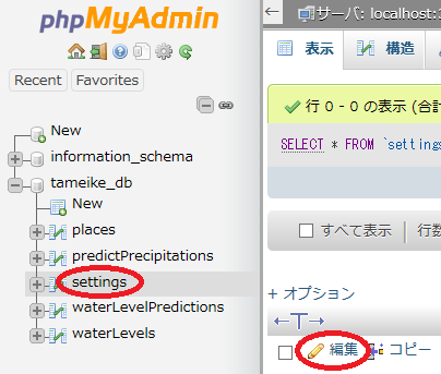 編集完了後「settings」テーブルをクリックし、settingsテーブル管理画面を開き、「編集」をクリックします。