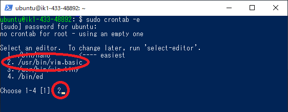エディターの選択が表示されますので、「/usr/bin/vim.basic」の番号を確認後(ここでは2番)、番号を入力し、「エンターキー」を入力します。