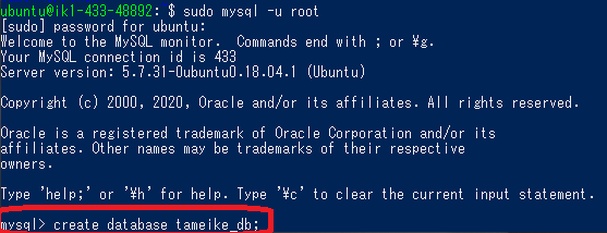 ログイン完了後、データベースの作成を行う為、下記コマンドを実行します。