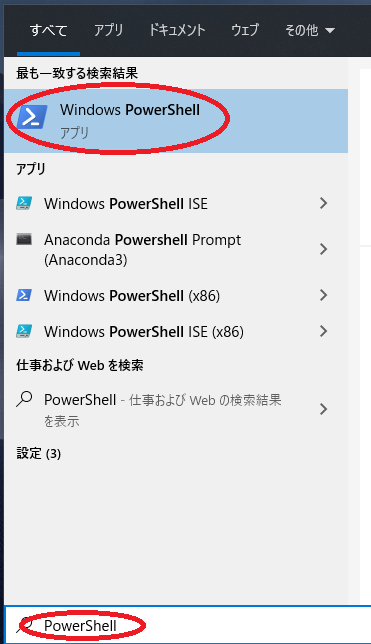 Windows PowerShellの起動を行います。キーボード「Windows」キーを入力し、スタートメニューを開き、「PowerShell」と入力します。
