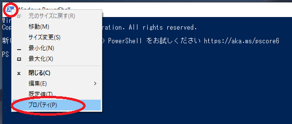 起動完了後、Windows PowerShellにコピー&ペーストをする為の設定を行います。ウィンドウ左上のアイコン画像を右クリックし、「プロパティ(P)」メニューをクリックします。