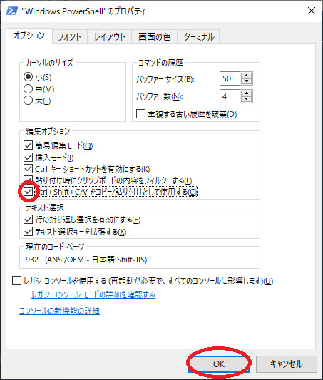「Ctrl+Shift+C/Vをコピー/貼り付けとして使用する(C)」にチェックを入れ、「OK」ボタンをクリックします。